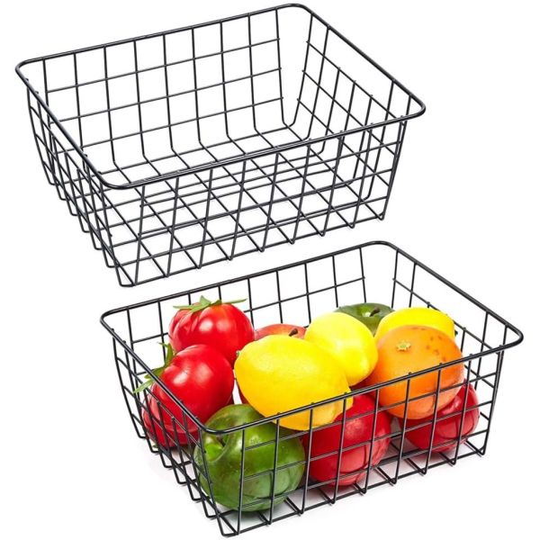 Simple Design Neatly Black Metal Wire Food Storage Basket Organizer with Wood Handles for Organizing Kitchen Cabinets, Pantry Shelf, Bathroom, Laundry Room, Closets, Garage.